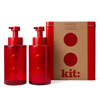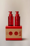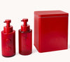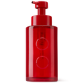 A revitalising hand wash in a red glass pump bottle.